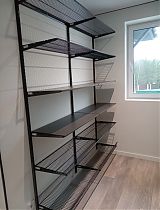 В комплект входят несущие рельсы и навесные направляющие, полки, штанги, аксессуары, крепежные элементы. Можно докупить множество дополнительных компонентов для гардеробной системы.