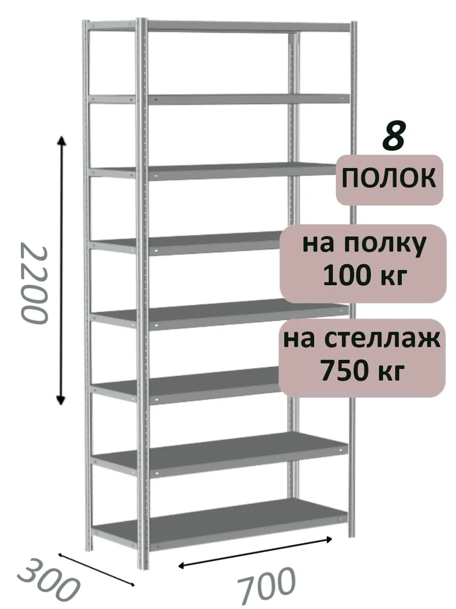 Стеллаж металлический полочный МС 2200х700х300, 8 полок, 100 кг на полку, светло-серый